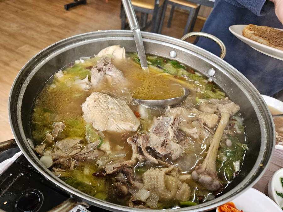 식당에 도착해서 예약자 이름을 말하니 4인 세팅 되어 있는 곳 원하는 자리에 앉으라고 했어요. 밑반찬은 여러 가지가 나오고 백숙이 나왔어요. 백숙은 나이 많으신 어르신이 잘라 주셨는데 뼈가루가 자를 때 떨어져서 굳이 안 잘라주셔도 될 것 같은 생각이 들었어요. 편하게 살 발라 드시라는 마음이신 듯해요.