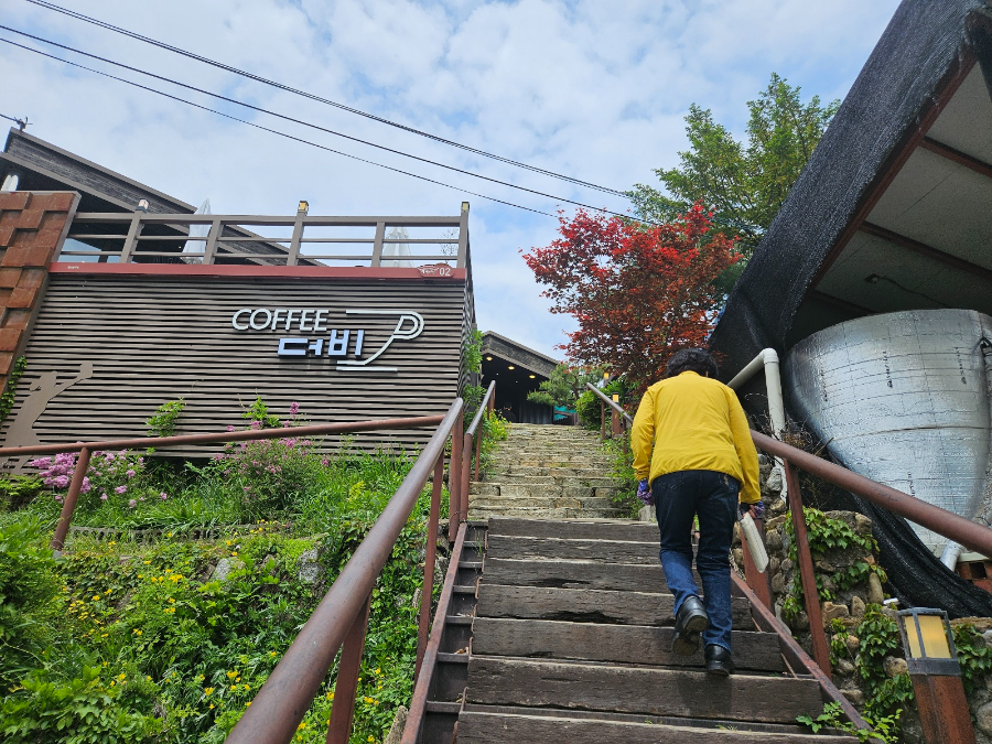 카페 더비는 경북식당에서 식사하고 걸어서 내려오다 보면 계단 있는 카페가 보여요. 높은 곳에 있는 카페가 뷰가 좋을 것 같아서 음료 마신 후 쉬었다가 산책하기로 했어요. 창문이 통유리로 되어 있어서 바깥풍경이 한눈에 다 보여서 좋았어요. 음료는 관광지 비슷한 가격대였고 아이스커피가 컵이 크지 않아서 약간 양이 적은 듯한 느낌이 들었어요. 커피 맛은 쏘쏘 했어요. ^^