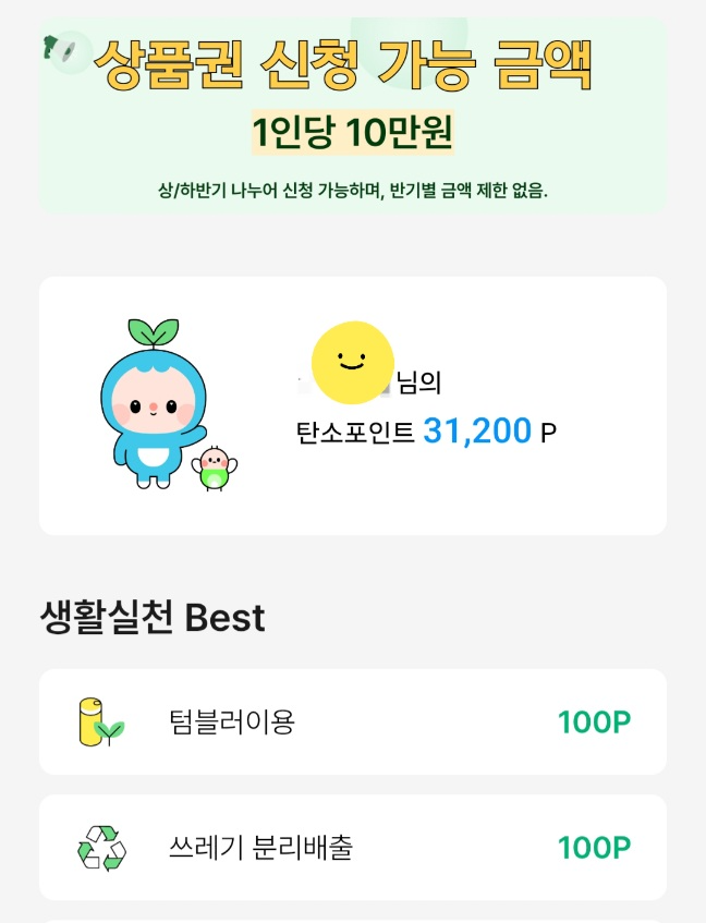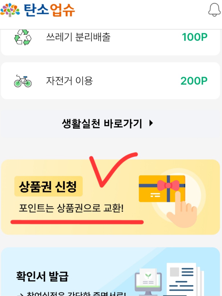 1. 탄소업슈 앱 화면에서 상품권 신청 선택.