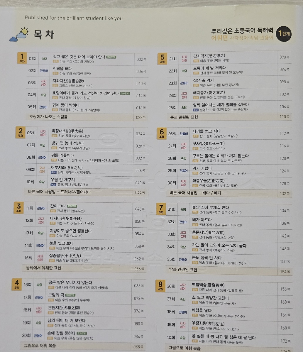 1단계는 초등 1~2학년 수준이며 그 외에 독해 시리즈는 저학년부터 고학년까지 단계별로 잘 구성되어 있어요. 책의 목차를 보면 다양한 어휘를 배울 수 있고 주간 학습 계획표가 있어서 평일 하루마다 할 수 있도록 지도할 수 있어요.