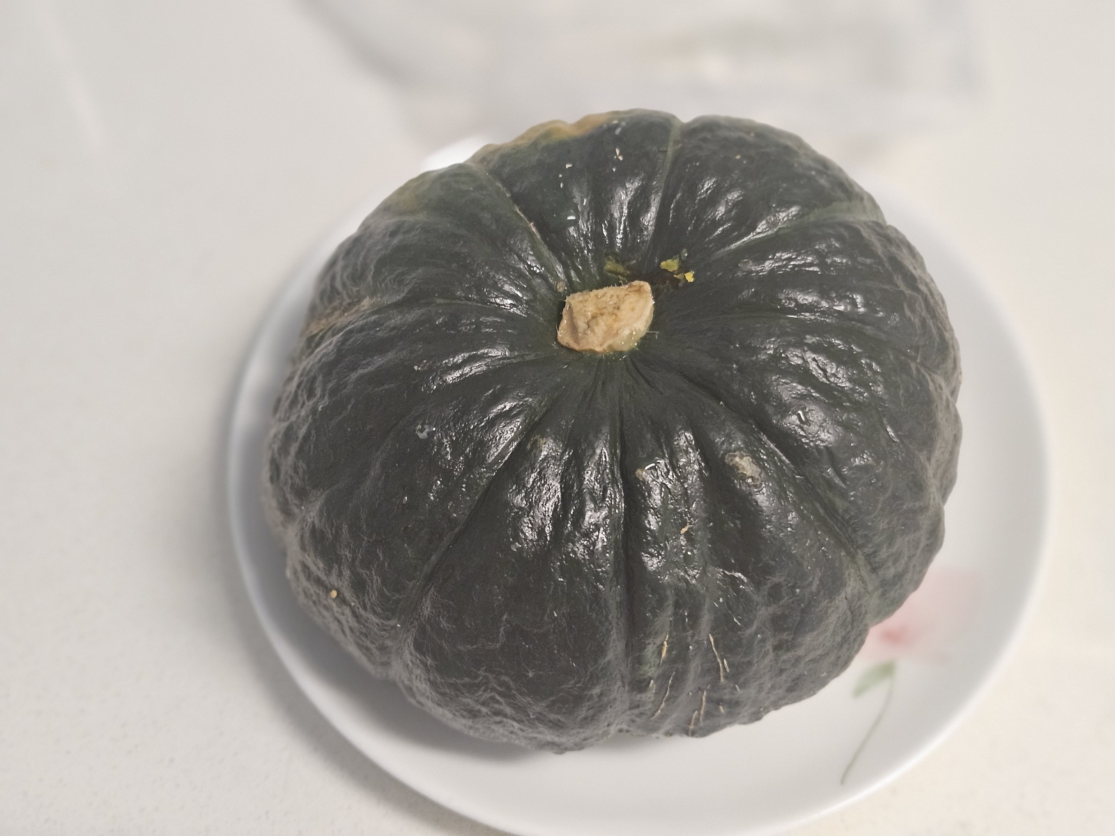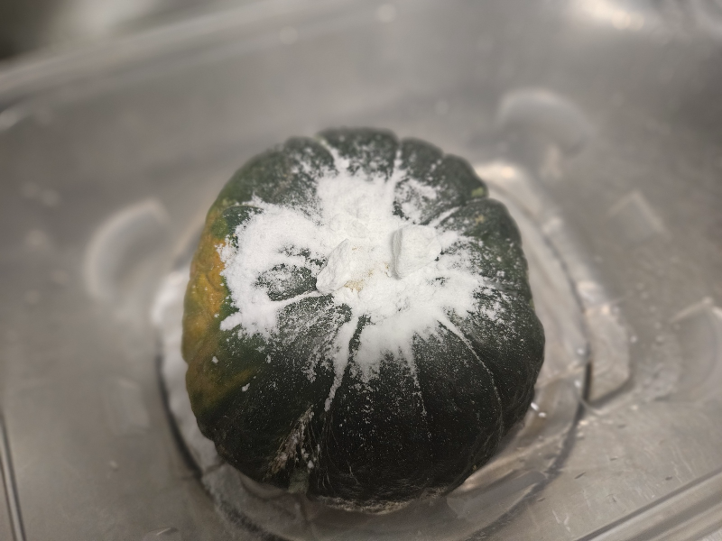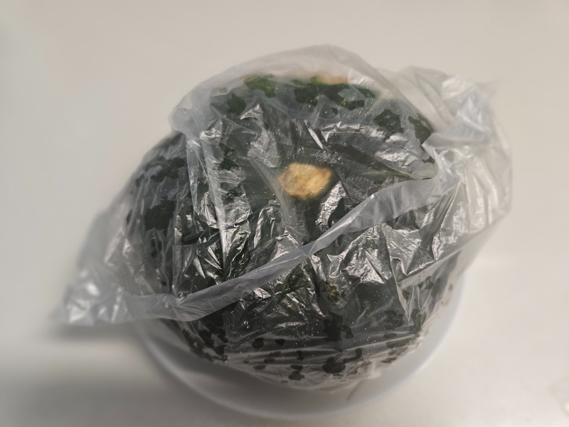 - 세척 후 단호박에 있는 물기는 제거하지 않으셔도 돼요. 접시를 준비한 후 비닐봉지에 단호박을 넣고 입구가 바닥방향으로 해서 단호박으로 눌러줄 수 있도록 해주세요.