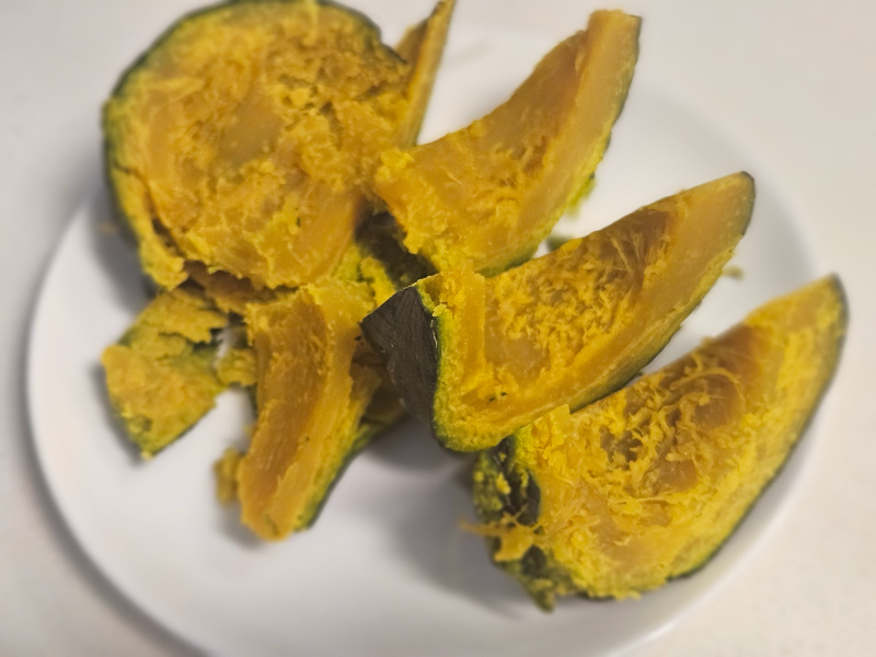 - 전자레인지로 손쉽게 단호박 찌기 끝! 7분 만에 단호박 찜이 완성되었어요.