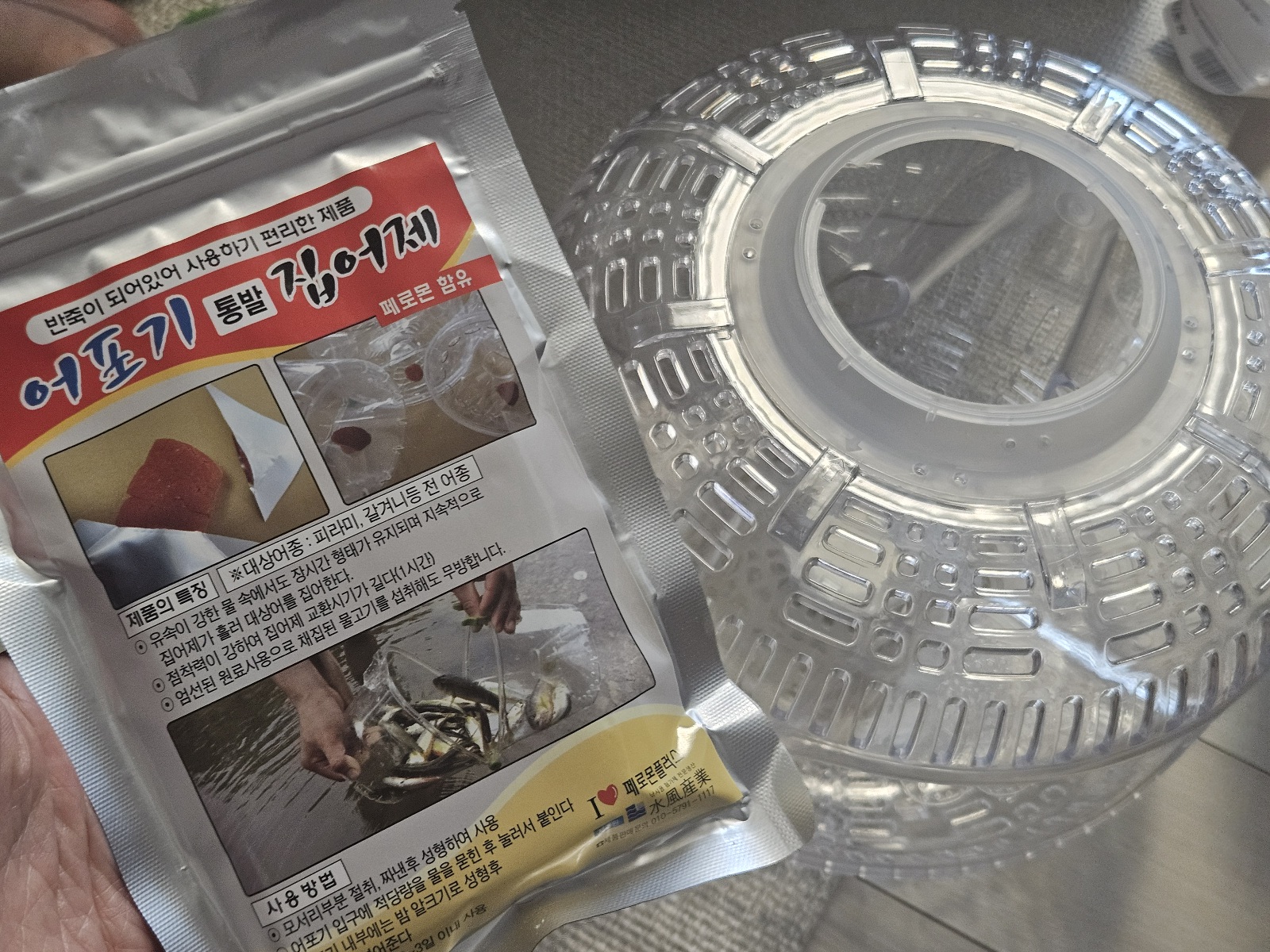 사람들이 적은 곳에 신랑이 어포기를 설치했어요. ㅋㅋ 잡힐지 궁금하긴 하네요. 어포기를 잠깐 소개하자면, 우주선 어포기+ 2구 비닐 어포기 통발 +집어제 세트 상품이에요. 세트에 만원 초반 가격대로 물고기 좋아하는 신랑이 가격 대비 괜찮은 세트 상품인 것 같다고 해요. (Tip! 우주선 어포기 물속에 넣을 때는 공기 방울이 잘 안 생기게 하는 것이 포인트라고 함. )