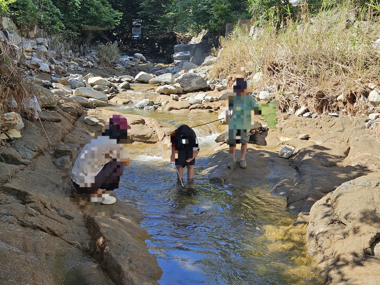 햇살이 뜨거운 날씨였지만 강당골 계곡 그늘은 시원했어요. 사실 덥지 않을까 걱정했거든요. 물에 발까지 담그고 있으면 더위가 금방 사라졌어요. 강당골 계곡, 사람들이 왜 여름에 많이 찾는지 알 수 있었던 것 같아요. 아들도 물고기 잡기 재미있었다고 다음에 또 잡으러 가자고 하네요. 조카도 퉁사리를 잡아서 만족해했어요.