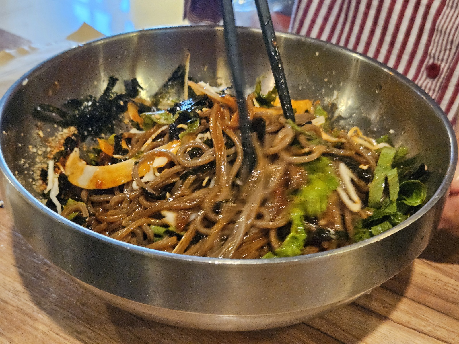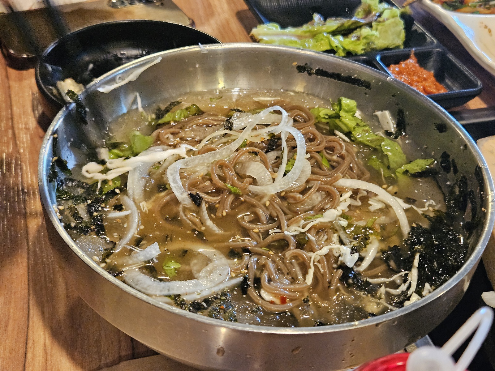 면은 메밀소바면발과 비슷한 느낌이었고 비빔막국수는 어머님이 드셨는데 맛이 괜찮다고 했어요. 맵거나 자극적이진 않아서 한 그릇 다 드셨어요. ㅋㅋ 물막국수는 냉면 육수가 들어간 맛이 났고 시원하고 깔끔했어요. 면만 다른 냉면을 먹는 느낌. 냉면을 워낙 좋아해서 신랑이랑 맛있게 나눠 먹었어요. 먹다가 찍어서 사진이 좀 그렇지만 양은 넉넉했어요.